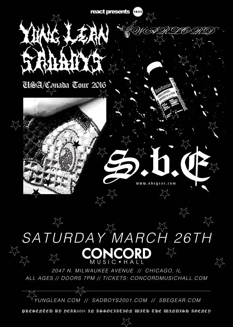 March 26th: Yung Lean Saturday, March 26, 2016 7:00 PM 11:00 PM 19:00 23:00 Concord Music Hall 2047 N Milwaukee Ave. Chicago, IL (map) Google Calendar ICS View fullsize Doors: 7:00PM | $22.00 | All AgesReact Presents | 1833 Presents BUY TICKETS View fullsize