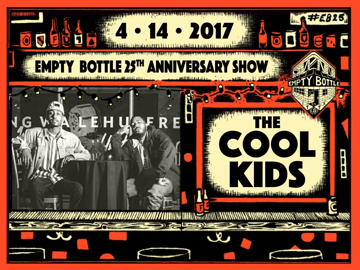 April 14: Empty Bottle 25th Anniversary Show feat. The Cool Kids Friday, April 14, 2017 9:00 PM 11:59 PM 21:00 23:59 The Empty Bottle 1035 N Western Ave Chicago, IL (map) Google Calendar ICS View fullsize Doors: 9:00PM | $25.00 | 21+Empty Bottle 25th Anniversary Show feat. The Cool Kids#EB25 Anniversary Series BUY TICKETS