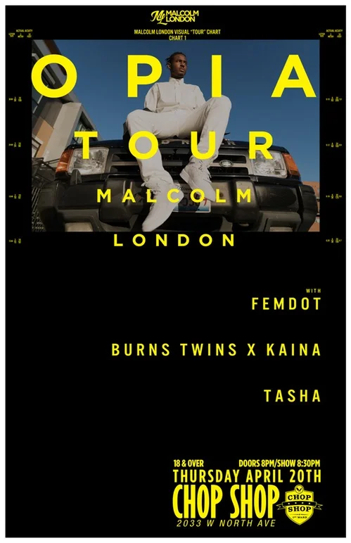 April 20: Malcolm London with Femdot, Kaina + The Burns Twins, Tasha Thursday, April 20, 2017 8:00 PM 11:59 PM 20:00 23:59 1st Ward at Chop Shop 2033 W. North Ave Chicago, IL (map) Google Calendar ICS View fullsize Doors: 8:00PM | $13.00 | 18+Malcolm London with Femdot, Kaina + The Burns Twins, TashaOPIA TOUR BUY TICKETS
