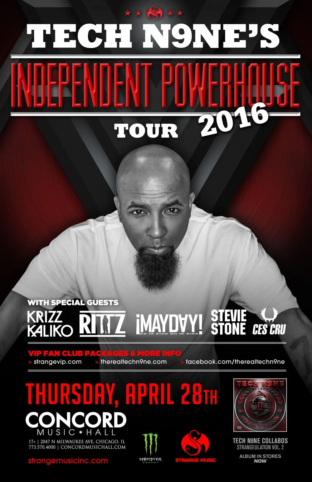April 28: Tech N9ne with Krizz Kaliko, Rittz, Mayday Thursday, April 28, 2016 5:00 PM 11:00 PM 17:00 23:00 Concord Music Hall 2047 N. Milwaukee Ave Chicago, IL (map) Google Calendar ICS View fullsize Doors: 5:00PM | $25.00 | 17+Tech N9ne's Independent Powerhouse Tour with Krizz Kaliko, Rittz, Mayday, Stevie Stone, CES CRU BUY TICKETS