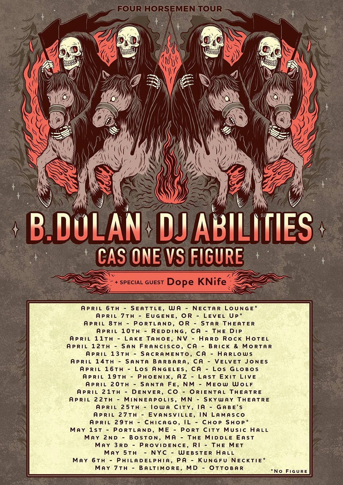April 29: B. Dolan with DJ Abilities, Cas One, Dope KNife Saturday, April 29, 2017 8:00 PM 11:30 PM 20:00 23:30 1st Ward at Chop Shop 2033 W. North Ave Chicago, IL (map) Google Calendar ICS Doors: 8:00PM | $15.00 | 21+B. Dolan with DJ Abilities, Cas One, Dope KNifeFour Horsemen Tour BUY TICKETS