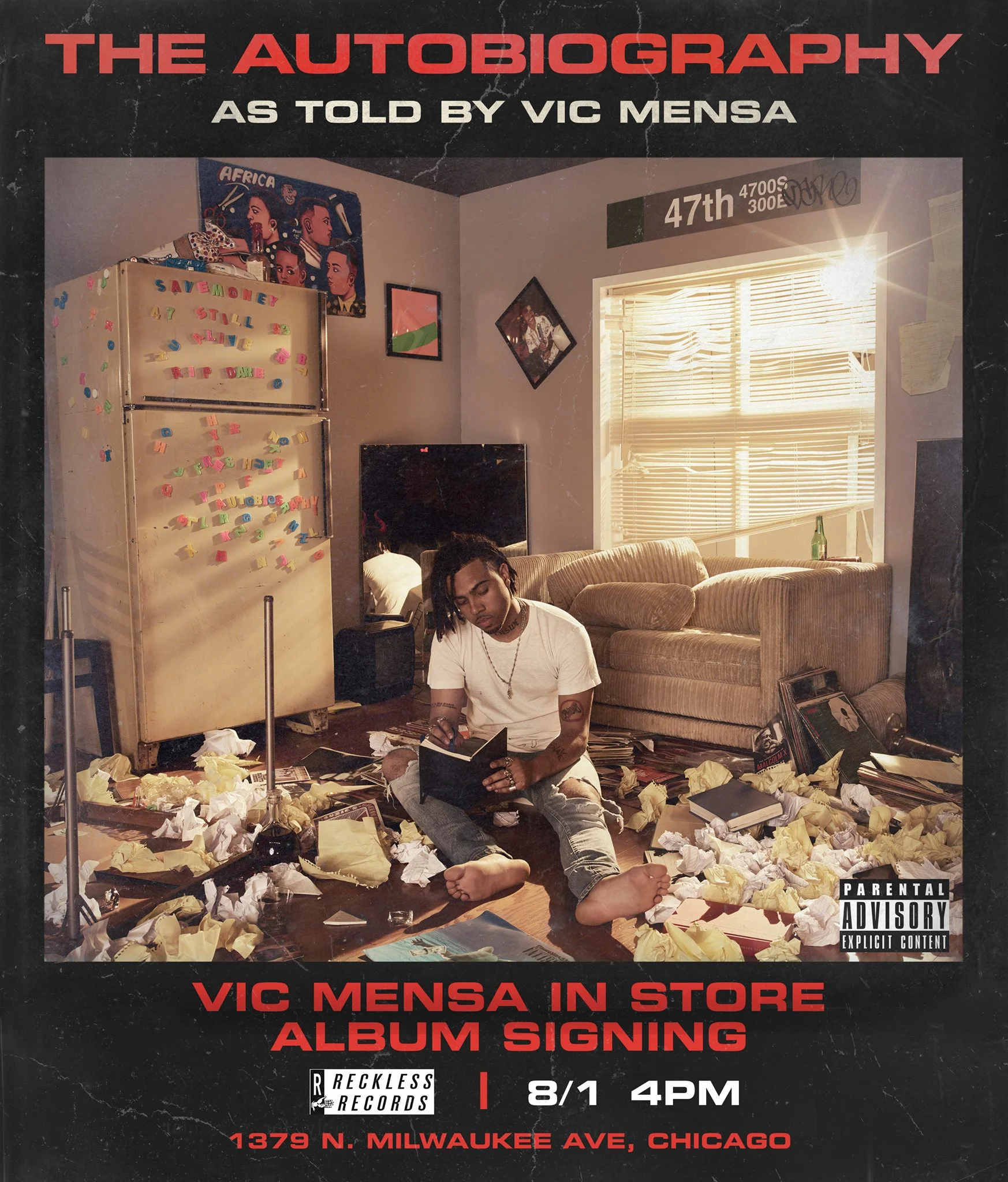 Aug. 1: Vic Mensa • The Autobiography 'In Store Album Signing' Tuesday, August 1, 2017 4:00 PM 6:00 PM 16:00 18:00 Reckless Records 1379 N Milwaukee Ave Chicago, IL (map) Google Calendar ICS Doors: 4:00PM | All AgesVic Mensa 'In Store Album Signing''The Autobiography' OUT NOW!