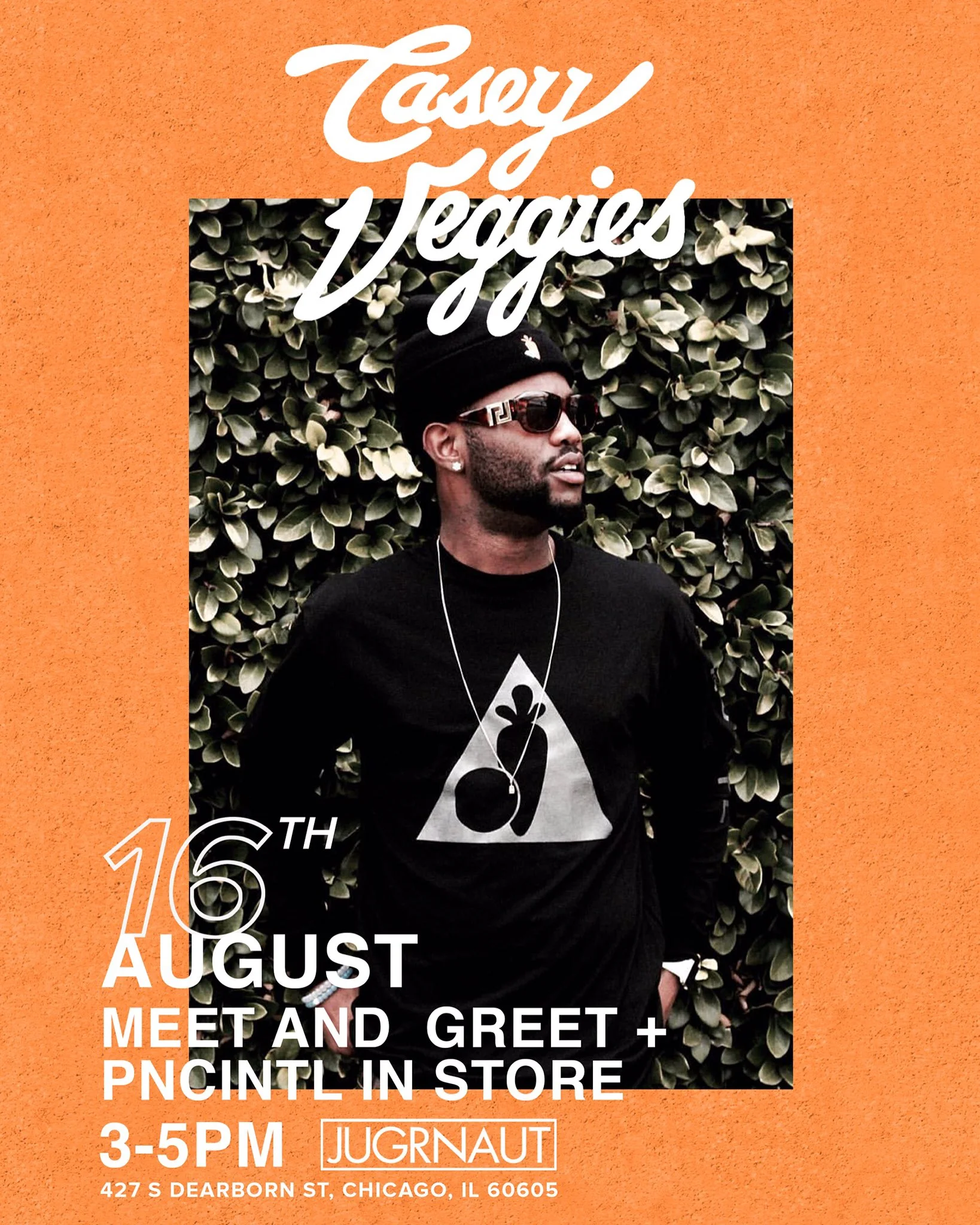Aug. 16: Casey Veggies (Meet & Greet) Tuesday, August 16, 2016 3:00 PM 5:00 PM 15:00 17:00 Jugrnaut 427 S Dearborn Chicago, IL (map) Google Calendar ICS View fullsize Casey Veggies 'PNCINTL' In Store and Meet & Greet: 3:00-5:00PMPresented by Jugrnaut