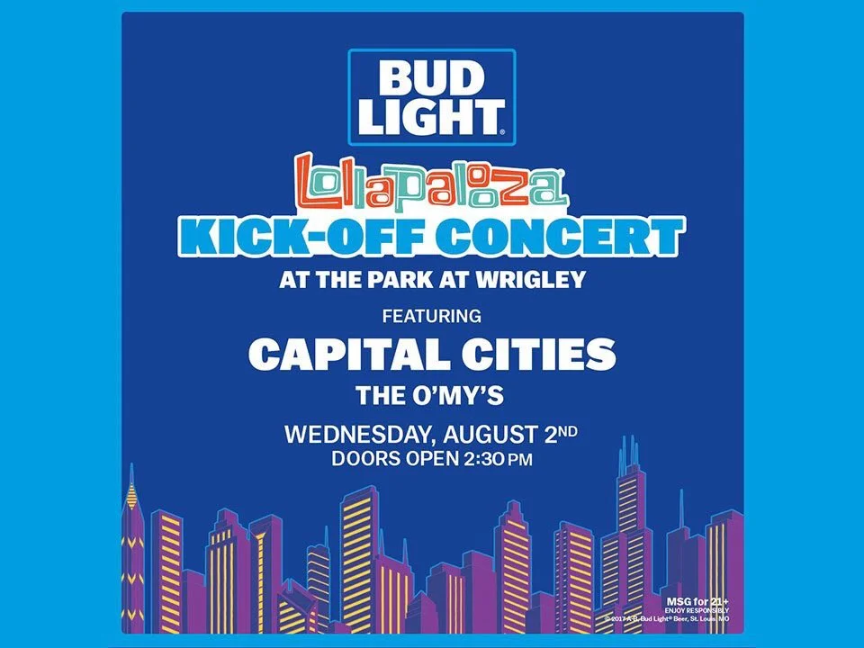 Aug. 2: Capital Cities with The O'My's [Lollapalooza Kick-Off Concert] Wednesday, August 2, 2017 2:30 PM 4:30 PM 14:30 16:30 The Park at Wrigley 1060 W Addison St. Chicago, IL (map) Google Calendar ICS Doors: 2:30PM | Free | All AagesCapital Cities with The O'My's [Lollapalooza Kick-Off Concert]