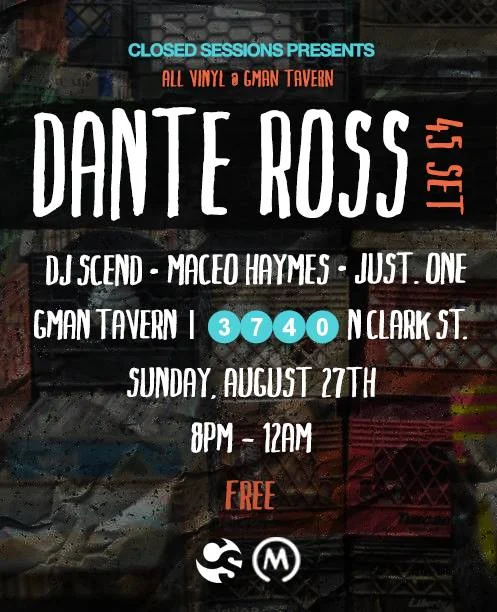 Closed Sessions presents a night of all vinyl dj-ing lead by Dante Ross and DJ Scend, Maceo Haymes and Just. One.