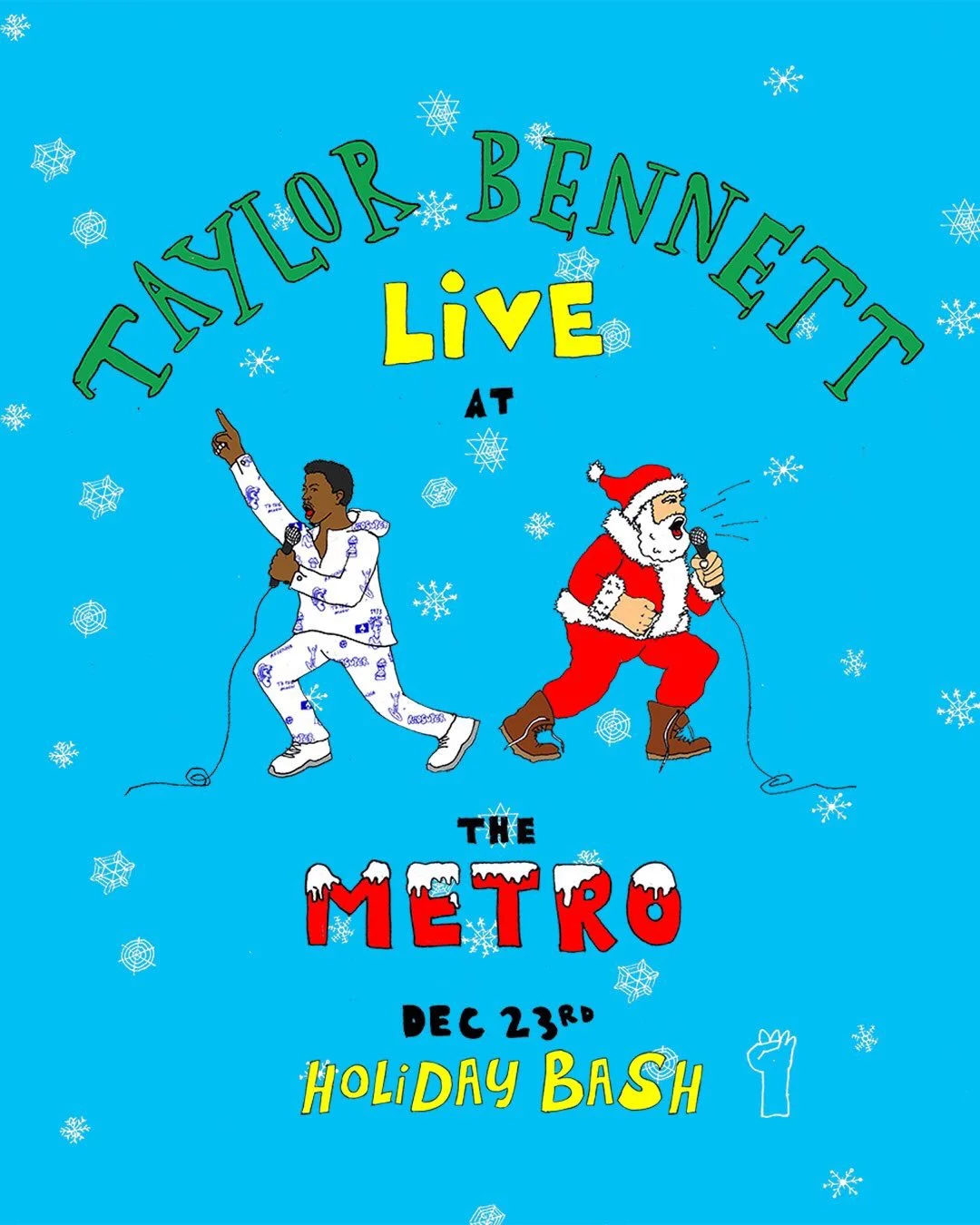 Dec. 23: Taylor Bennett (Holiday Bash) Friday, December 23, 2016 6:00 PM 11:30 PM 18:00 23:30 Metro 3730 N Clark St. Chicago, IL (map) Google Calendar ICS View fullsize Doors: 6:00PM | $15.00 | All AgesTaylor Bennett 'Holiday Bash' at The Metro BUY TICKETS