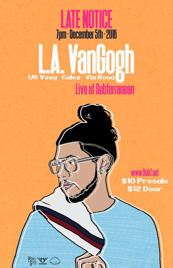 Dec. 5: L.A. VanGogh with UG Vavy, Calez, Via Rosa Monday, December 5, 2016 7:00 PM 11:30 PM 19:00 23:30 Subterranean 2011 W North Ave Chicago, IL (map) Google Calendar ICS View fullsize Doors: 7:00PM | $7.00-$12.00 | 17+L.A. VanGogh with UG Vavy, Calez, Via RosaPrivate Stock | Ovrlord | These Days BUY TICKETS