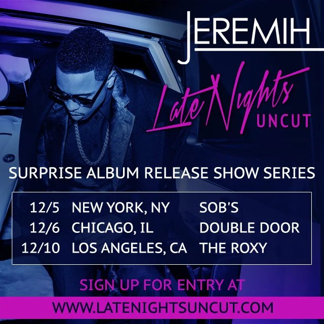 Dec. 6: Jeremih (Late Nights Uncut - Surprise Album Release Show) Sunday, December 6, 2015 9:00 PM 11:59 PM 21:00 23:59 Double Door 1572 N Milwaukee Ave. Chicago, IL (map) Google Calendar ICS View fullsize (Late Nights Uncut - Surprise Album Release Show)Times + Additional Info TBD SIGN UP