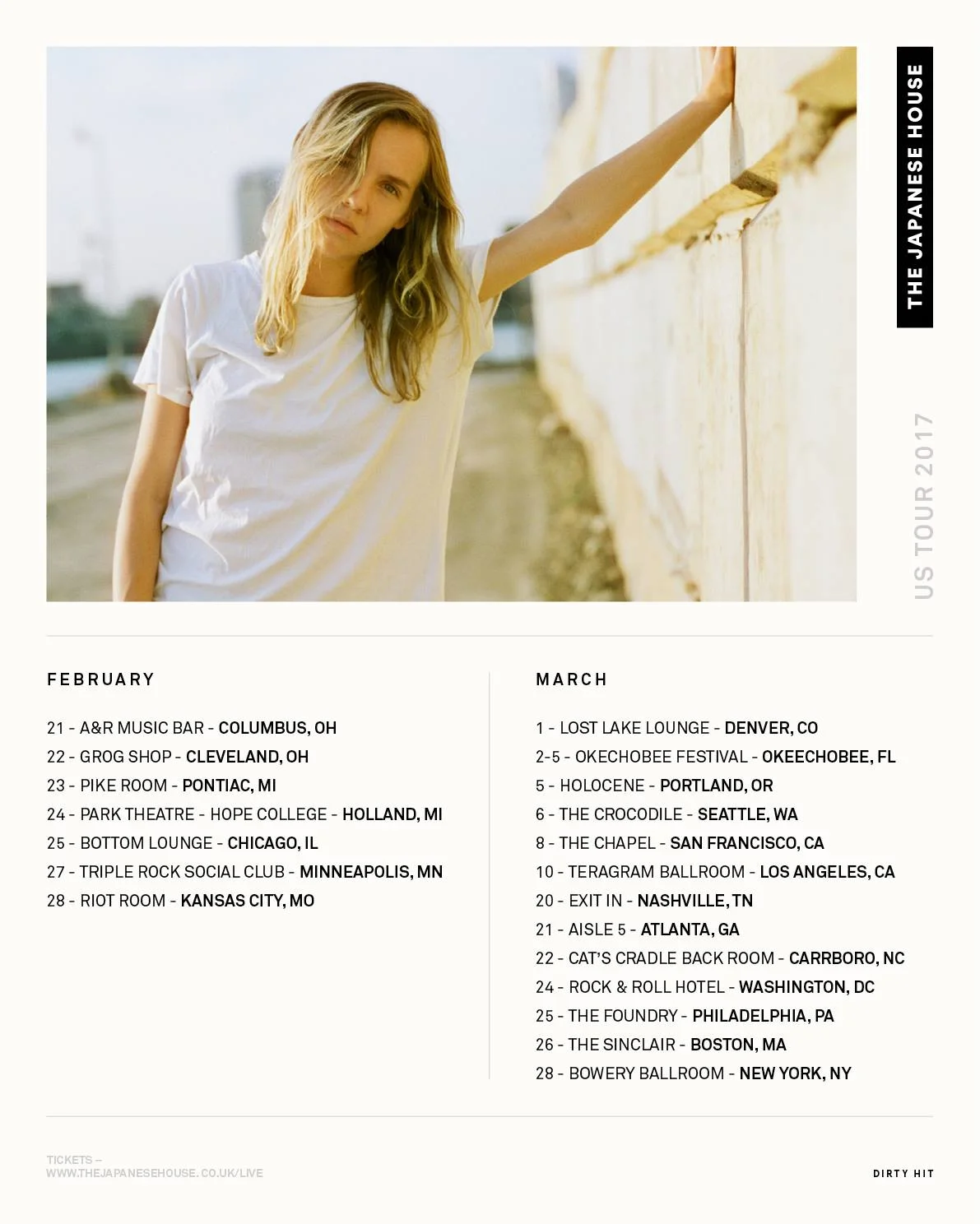 Feb. 25: The Japanese House Saturday, February 25, 2017 6:30 PM 11:30 PM 18:30 23:30 Bottom Lounge 1375 W Lake St. Chicago, IL (map) Google Calendar ICS View fullsize Doors: 6:30PM | $16.00 | All AgesThe Japanese House • US Tour 2017 BUY TICKETS View fullsize
