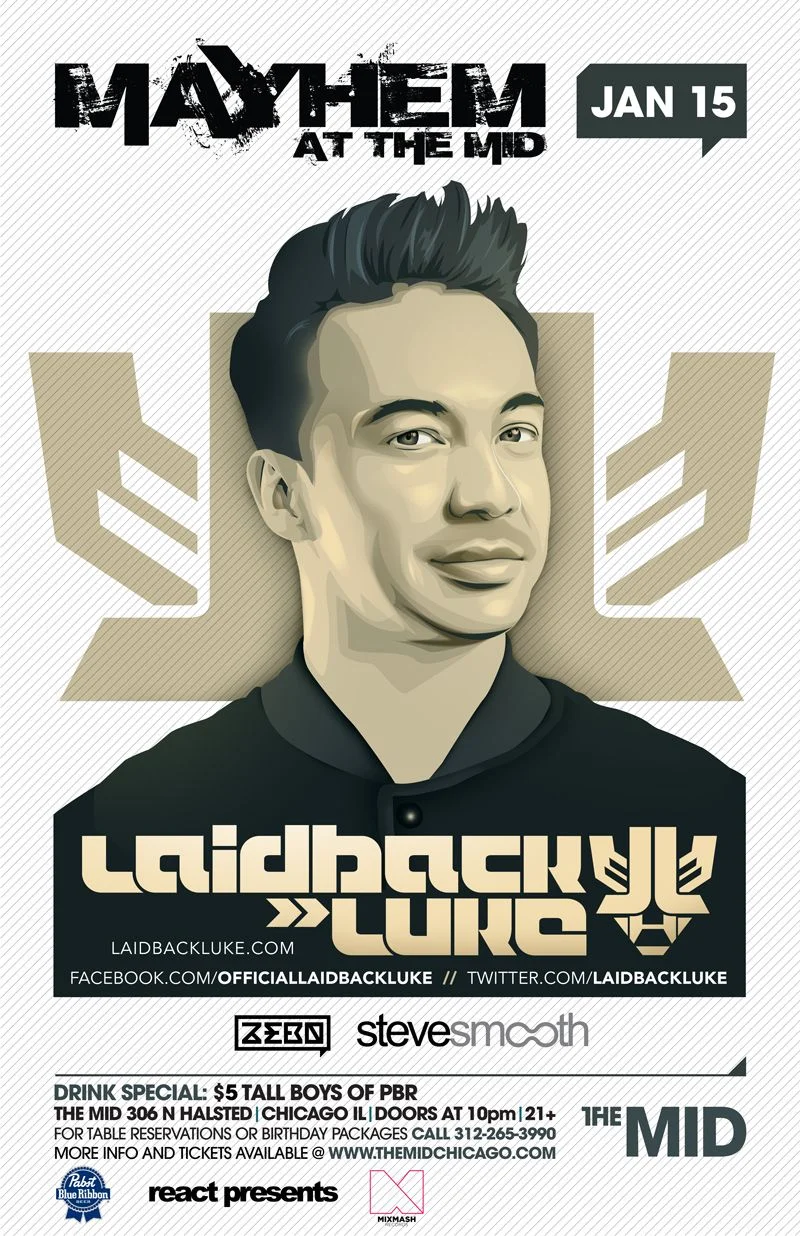 Jan. 15: Laidback Luke Friday, January 15, 2016 10:00 PM 11:59 PM 22:00 23:59 The MID 306 N Halsted Chicago, IL (map) Google Calendar ICS View fullsize Doors: 10:00PM | $15.00-25.00 | 21+with Zebo + SteveSmoothReact Presents | Mayhem at The MID | PBR | MixMash RSVP/BUY TICKETS