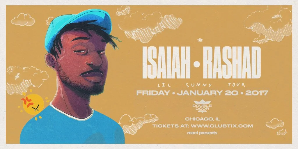 Jan. 20: Isaiah Rashad Friday, January 20, 2017 8:00 PM 11:30 PM 20:00 23:30 Double Door 1572 N Milwaukee Ave. Chicago, IL (map) Google Calendar ICS View fullsize Doors: 8:00PM | $15.00 | 18+Isaiah Rashad • Lil Sunny TourReact Presents BUY TICKETS