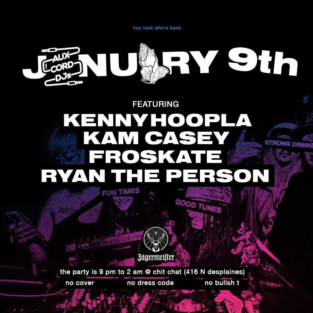 Aux Cord DJs Featuring KennyHoopla, Kam Casey, froSkate and Ryan The Person Thursday, January 9, 2020 9:00 PM 11:59 PM 21:00 23:59 Chit Chat 416 N Desplaines St Chicago, IL (map) Google Calendar ICS Doors: 9:00PM | No Cover | 21+Aux Cord DJs Featuring KennyHoopla, Kam Casey, froSkate and Ryan The Person MORE INFO