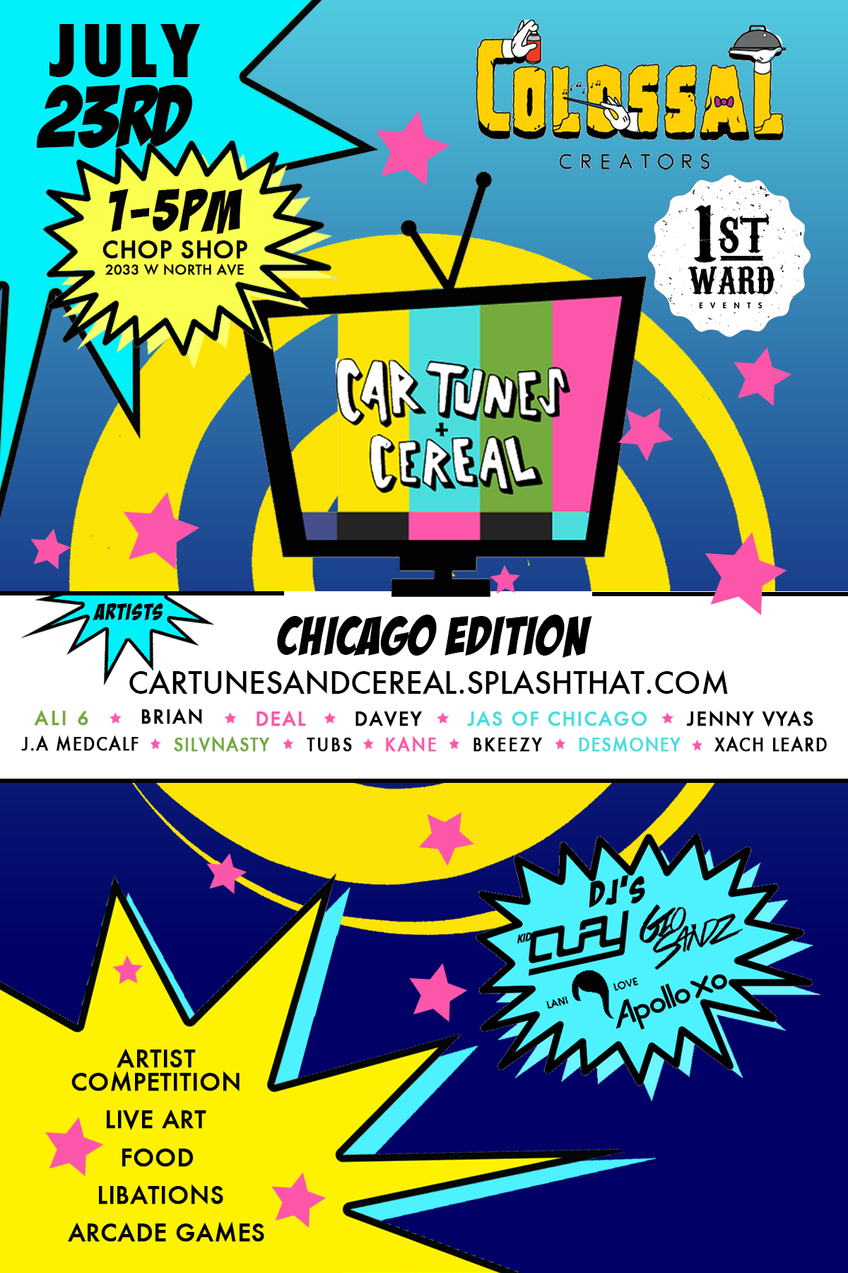 A creative showcase and day party combined, Colossal Creators is taking you back to the 90s with Car Tunes and Cereal. We’re travelling back in time to the Saturdays you wish you had as a kid, but could only experience as an adult. We've got 15 Chicago artists battling it out for a chance to have their cereal box design placed in stores, surrounded by: