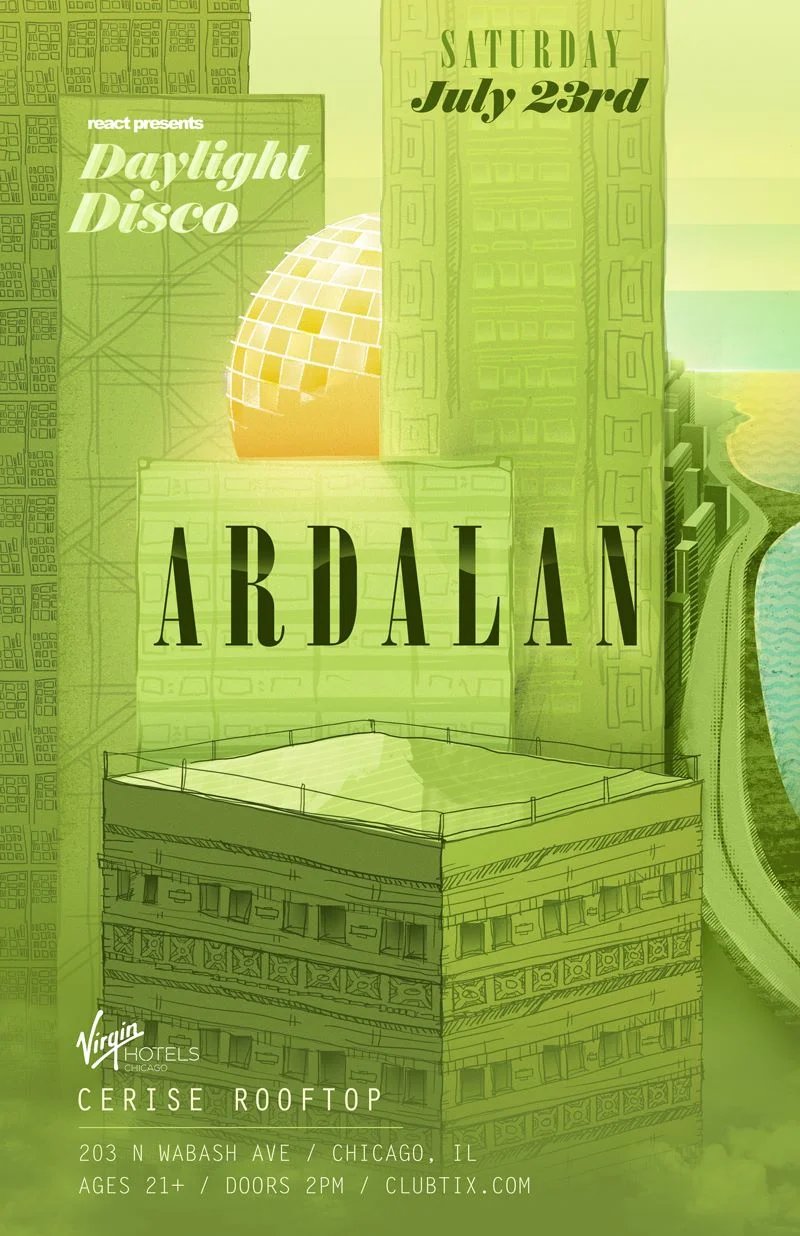 July 23: React Presents Daylight Disco feat. Ardalan (Dirtybird) Saturday, July 23, 2016 2:00 PM 11:59 PM 14:00 23:59 Virgin Hotel Chicago - CERISE Rooftop 203 N. Wabash Ave. Chicago, IL (map) Google Calendar ICS View fullsize Doors: 2:00PM | $10.00 | 21+React Presents: Daylight Disco with Ardalan (Dirtybird) BUY TICKETS