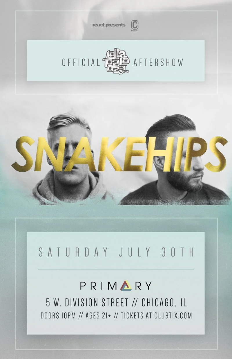 July 30: Snakehips Saturday, July 30, 2016 10:00 PM 11:59 PM 22:00 23:59 Primary 5 W. Division St. Chicago, IL (map) Google Calendar ICS View fullsize Doors: 10:00PM | $20.00-25.00 | 21+Official Lollapalooza After Party | React Presents & C3 Presents: Snakehips BUY TICKETS