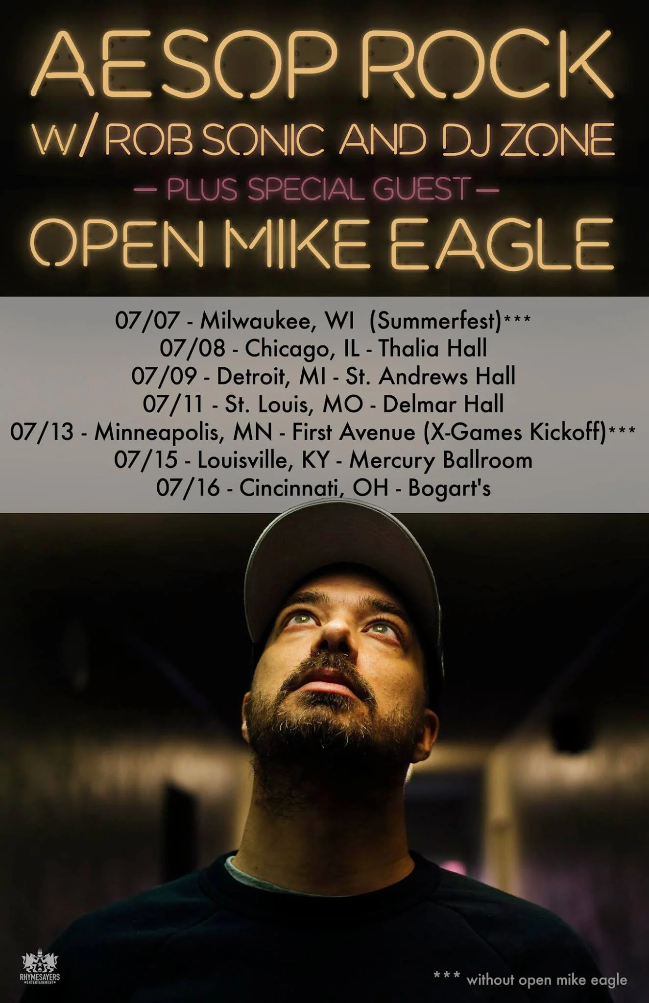 July 8: Aesop Rock with Open Mike Eagle, Rob Sonic, DJ Zone Saturday, July 8, 2017 7:00 PM 11:30 PM 19:00 23:30 Thalia Hall 1807 S Allport St Chicago, IL (map) Google Calendar ICS Doors: 7:00PM | $26.00 | 17+Aesop Rock with Open Mike Eagle, Rob Sonic, DJ Zone BUY TICKETS