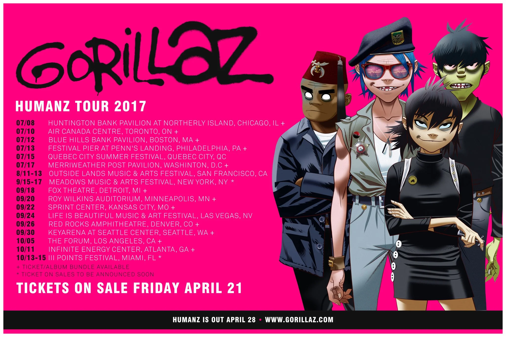 July 8: Gorillaz • Humanz Tour 2017 Saturday, July 8, 2017 7:30 PM 11:30 PM 19:30 23:30 Huntington Bank Pavilion at Northerly Island 1300 S Linn White Dr Chicago, IL (map) Google Calendar ICS Doors: 7:30PM | $100.00+ | All AgesGorillaz • Humanz Tour 2017 BUY TICKETS