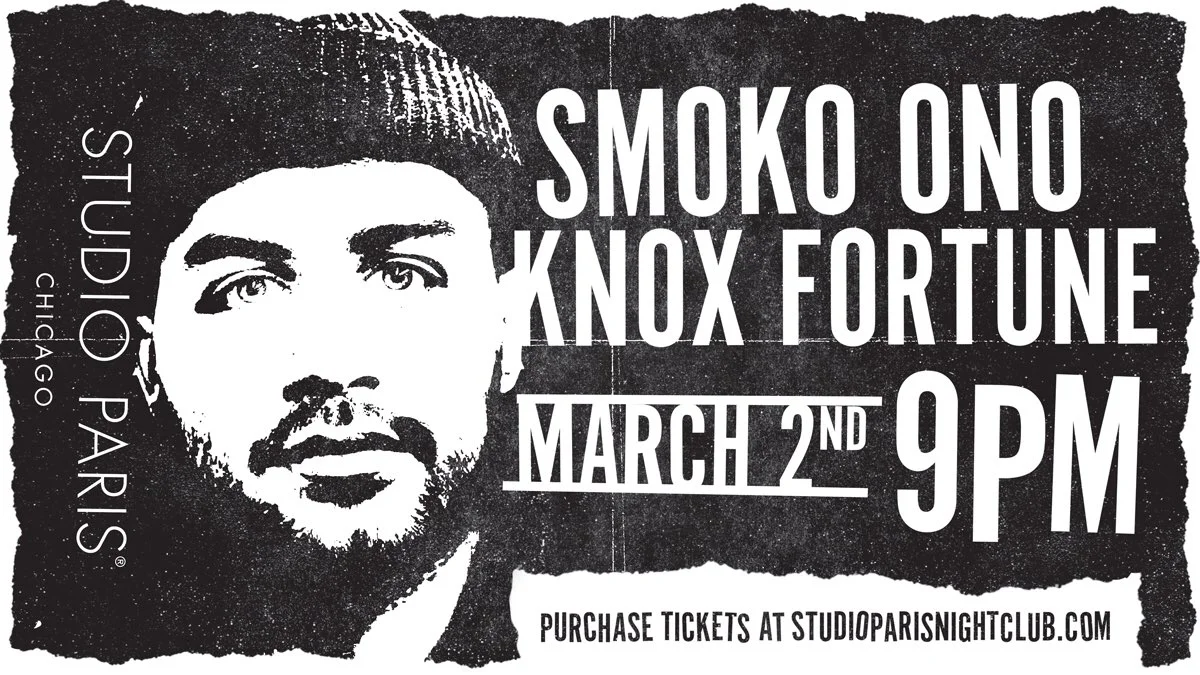March 2: Smoko Ono & Knox Fortune [DJ Sets] Thursday, March 2, 2017 9:00 PM 11:59 PM 21:00 23:59 Studio Paris 59 W Hubbard St. Chicago, IL (map) Google Calendar ICS Doors: 9:00PM | $5.00 | 21+Smoko Ono & Knox Fortune [DJ Sets] BUY TICKETS