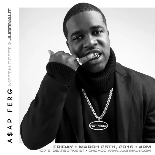March 25: A$AP Ferg Meet & Greet Friday, March 25, 2016 4:00 PM 6:00 PM 16:00 18:00 Jugrnaut 427 N. Dearborn Chicago, IL (map) Google Calendar ICS View fullsize Doors: 4:00-6:00PM | FREE | All AgesJugrnaut Presents MORE INFO