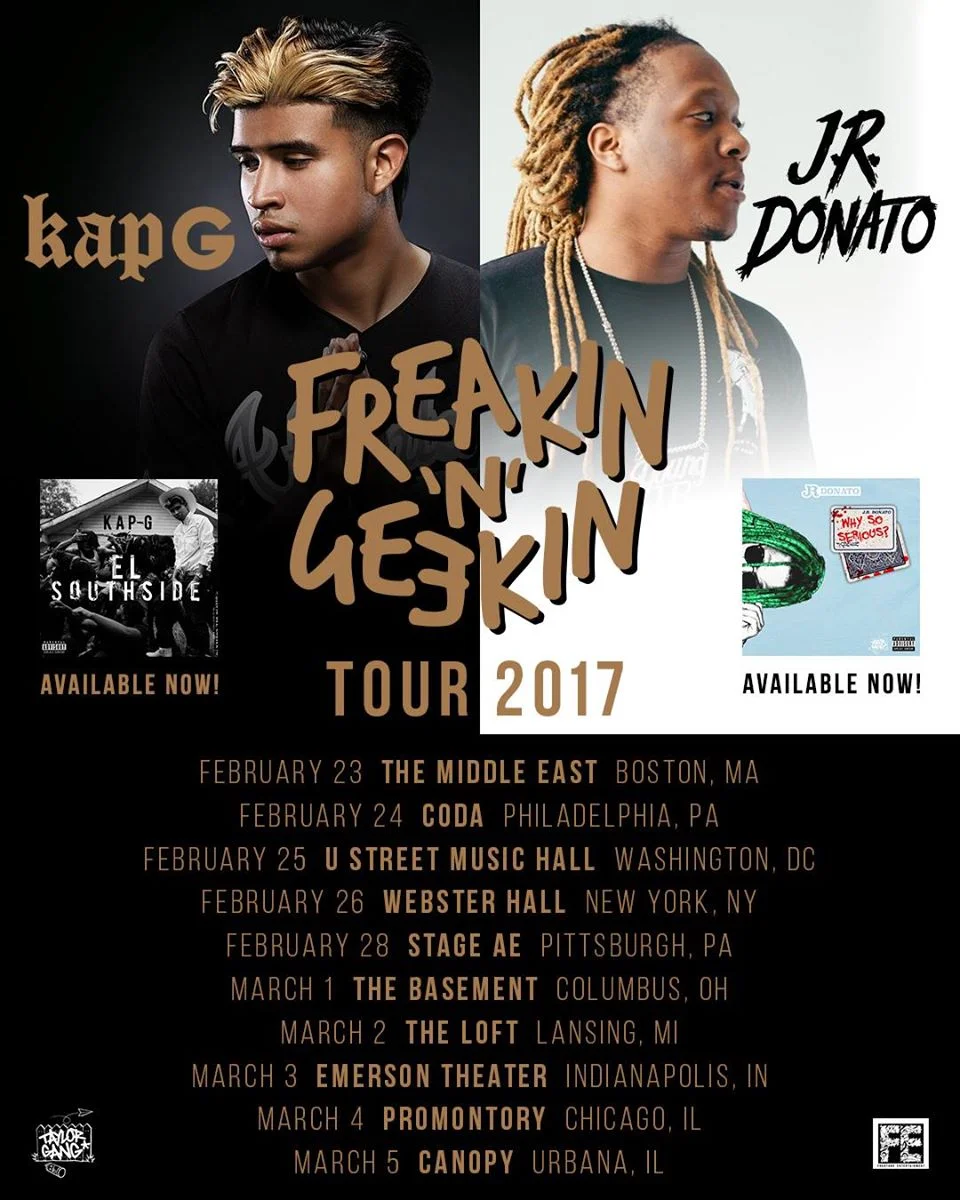 March 4: KapG & J.R. Donato with Arkadian Saturday, March 4, 2017 6:00 PM 11:30 PM 18:00 23:30 The Promontory 5311 S Lake Park Ave. Chicago, IL (map) Google Calendar ICS View fullsize Doors: 6:00PM | $17.00 | All AgesKapG & J.R. Donato • 'Freekin N Geekin' Tourwith ArkadianSean Healy Presents BUY TICKETS