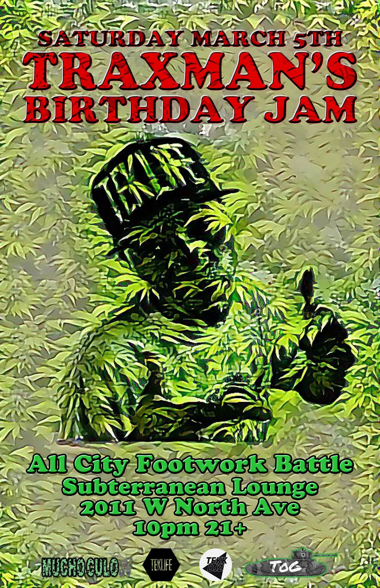 March 5: Traxman's Birthday Jam + All City Footwork Battle Saturday, March 5, 2016 10:00 PM 11:59 PM 22:00 23:59 Subterranean 2011 W North Ave Chicago, IL (map) Google Calendar ICS View fullsize Doors: 10:00PM | FREE before 12AM | 21+Mucho Culo Presents:Traxman's Birthday Jam + All City Footwork Battle MORE INFO
