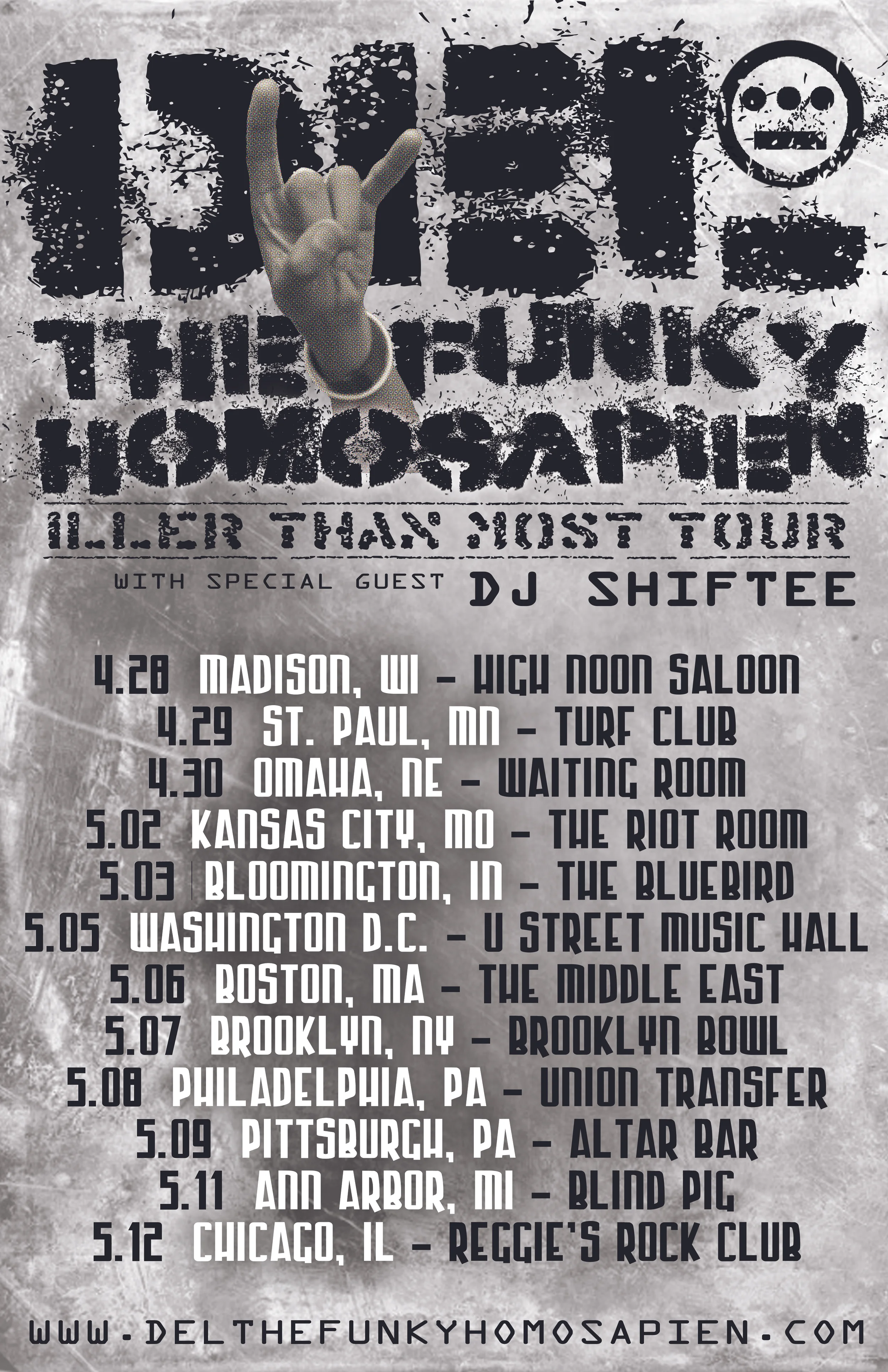 May 12: Del The Funky Homosapien Thursday, May 12, 2016 6:30 PM 11:30 PM 18:30 23:30 Reggies 2105 S State St. Chicago, IL (map) Google Calendar ICS View fullsize Doors: 6:30PM | TBD | 17+Del The Funky Homosapien with Special GuestsIller Than Most Tour with DJ SHIFTEE1833 Presents BUY TICKETS