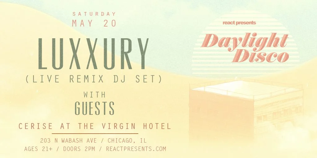 May 20: Daylight Disco: Luxxury (DJ Set) Saturday, May 20, 2017 2:00 PM 8:00 PM 14:00 20:00 Cerise - Virgin Hotel 203 N. Wabash Avenue Chicago, IL (map) Google Calendar ICS Doors: 2:00PM | $10.00-15.00 | 21+Daylight Disco: Luxxury (Live Remix DJ Set) + Special GuestsReact Presents BUY TICKETS