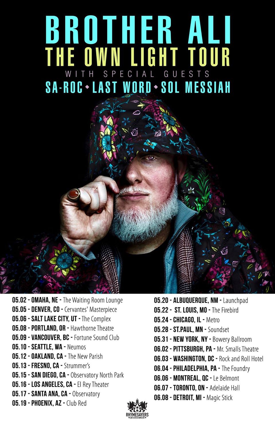May 24: Brother Ali with Sa-Roc, Last Word, Soul Messiah Wednesday, May 24, 2017 8:00 PM 11:30 PM 20:00 23:30 Google Calendar ICS View fullsize Doors: 8:00PM | $18.00 | 18+Brother Ali • The Own Light Tourwith Sa-Roc, Last Word, Soul Messiah BUY TICKETS