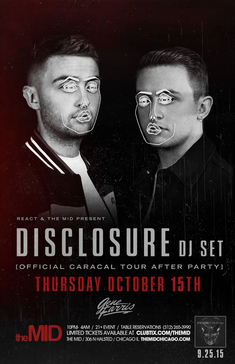 Oct. 15: Disclosure (DJ Set) [After Party] Thursday, October 15, 2015 10:00 PM 11:59 PM 22:00 23:59 The Mid 206 N. Halsted Chicago, IL (map) Google Calendar ICS View fullsize Doors: 10:00PM | $20.00-30.00 | 21+Official Caracal Tour After Party / with Gene Farris BUY TICKETS