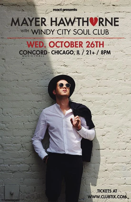 Oct. 26: Mayer Hawthorne Wednesday, October 26, 2016 8:00 PM 11:59 PM 20:00 23:59 Concord Music Hall 2047 N. Milwaukke Ave Chicago, IL (map) Google Calendar ICS View fullsize Doors: 8:00PM | $22.00 | 21+Mayer Hawthorne with Windy City Social ClubReact Presents BUY TICKETS