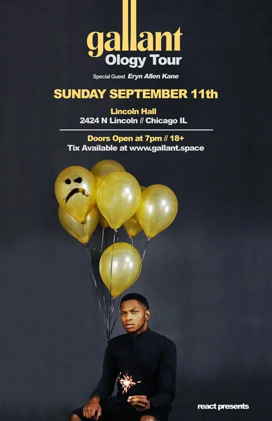 Sept. 11: Gallant with Eryn Allen Kane Sunday, September 11, 2016 7:00 PM 11:59 PM 19:00 23:59 Lincoln Hall 2424 N Lincoln Ave. Chicago, IL (map) Google Calendar ICS View fullsize Doors: 7:00PM | $15.00 | 18+Gallant with Eryn Allen KaneOlogy Tour | React Presents BUY TICKETS