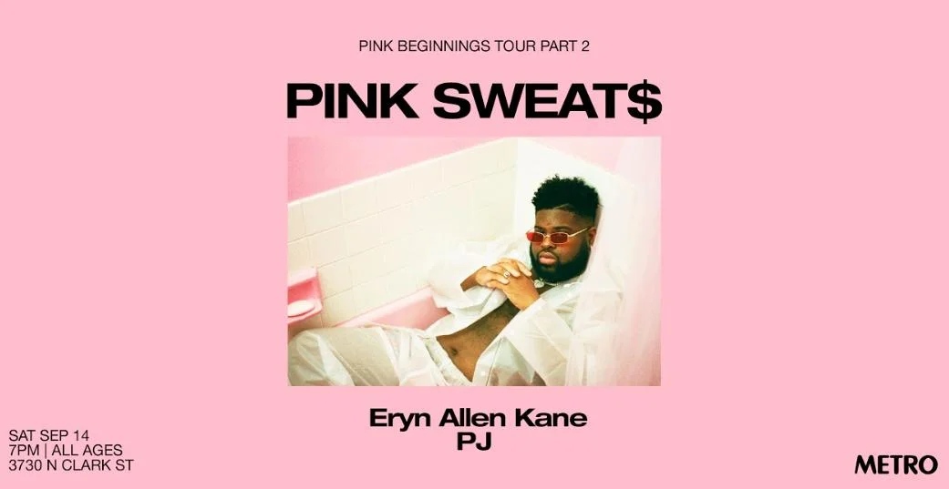 Pink Sweat$ with Eryn Allen Kane and PJ Saturday, September 14, 2019 6:00 PM 11:30 PM 18:00 23:30 Metro 3730 N. Clark St Chicago, IL (map) Google Calendar ICS Doors: 6:00PM | $18-64.00 | All AgesPink Sweat$ • Pink Beginnings Tour Part 2with Eryn Allen Kane and PJ BUY TICKETS
