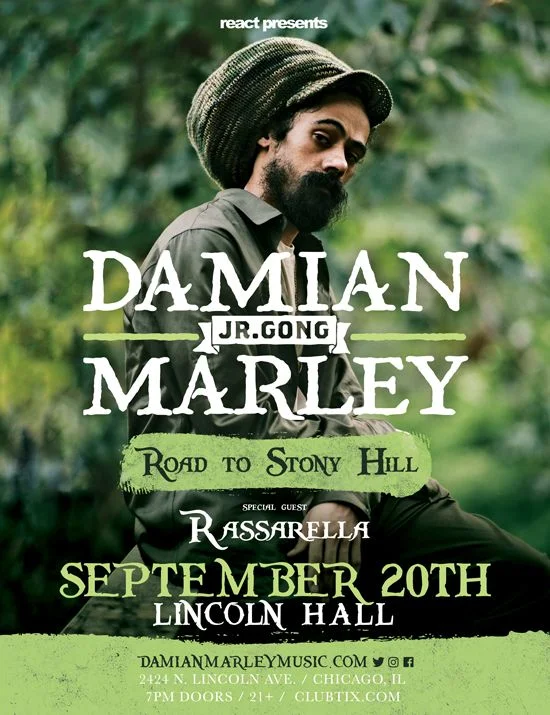 Sept. 20: Damian 'Jr. Gong' Marley Tuesday, September 20, 2016 7:00 PM 11:59 PM 19:00 23:59 Lincoln Hall 2414 N. Lincoln Ave Chicago, IL (map) Google Calendar ICS View fullsize Doors: 7:00PM | $36.00 | 21+Damian 'Jr. Gong' Marley • Road To Stony Hillwith Special Guest Rassarella BUY TICKETS