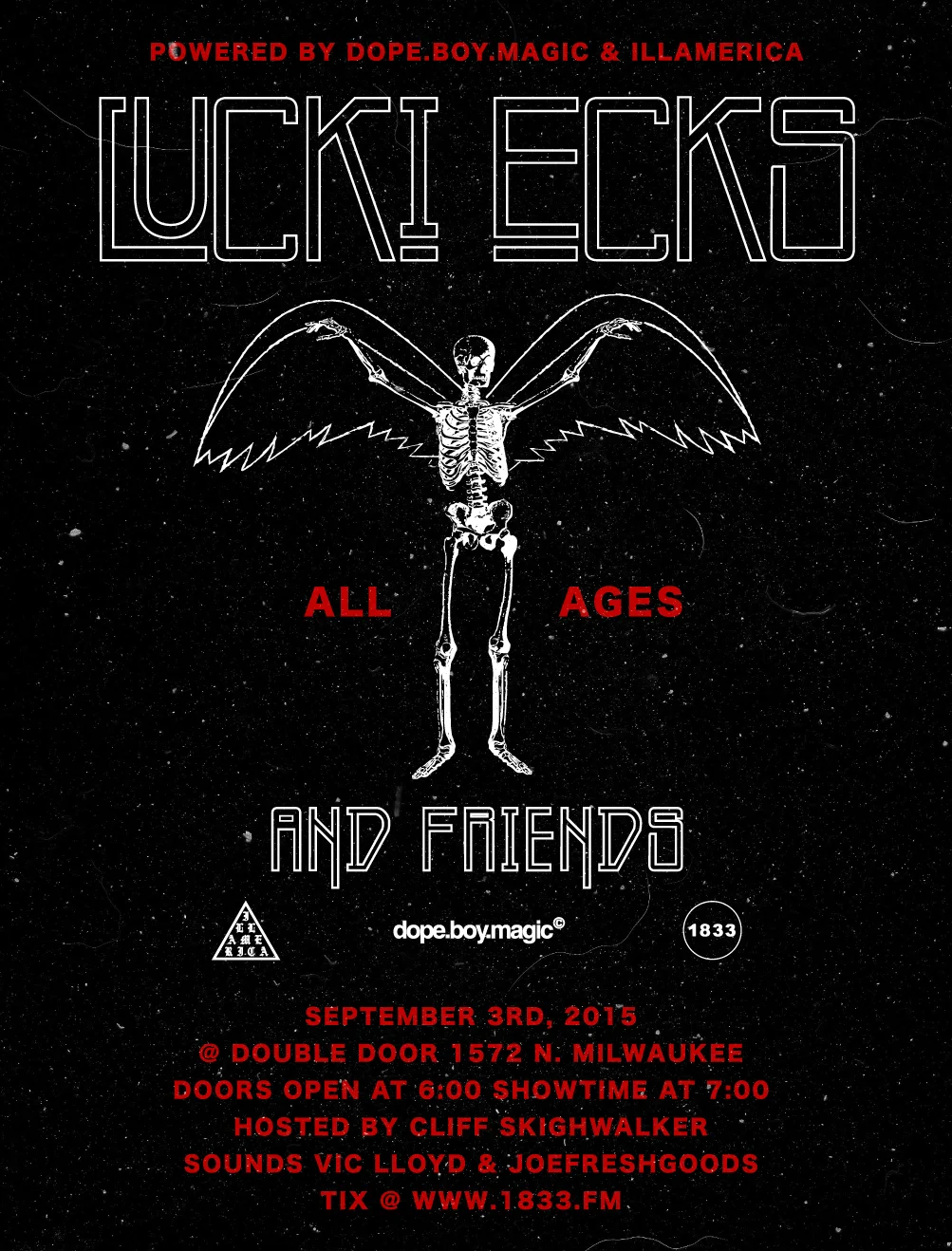 Sept. 3: Lucki Eck$ Thursday, September 3, 2015 6:00 PM 11:30 PM 18:00 23:30 Double Door 1572 N Milwaukee Ave. Chicago, IL (map) Google Calendar ICS View fullsize BUY TICKETS