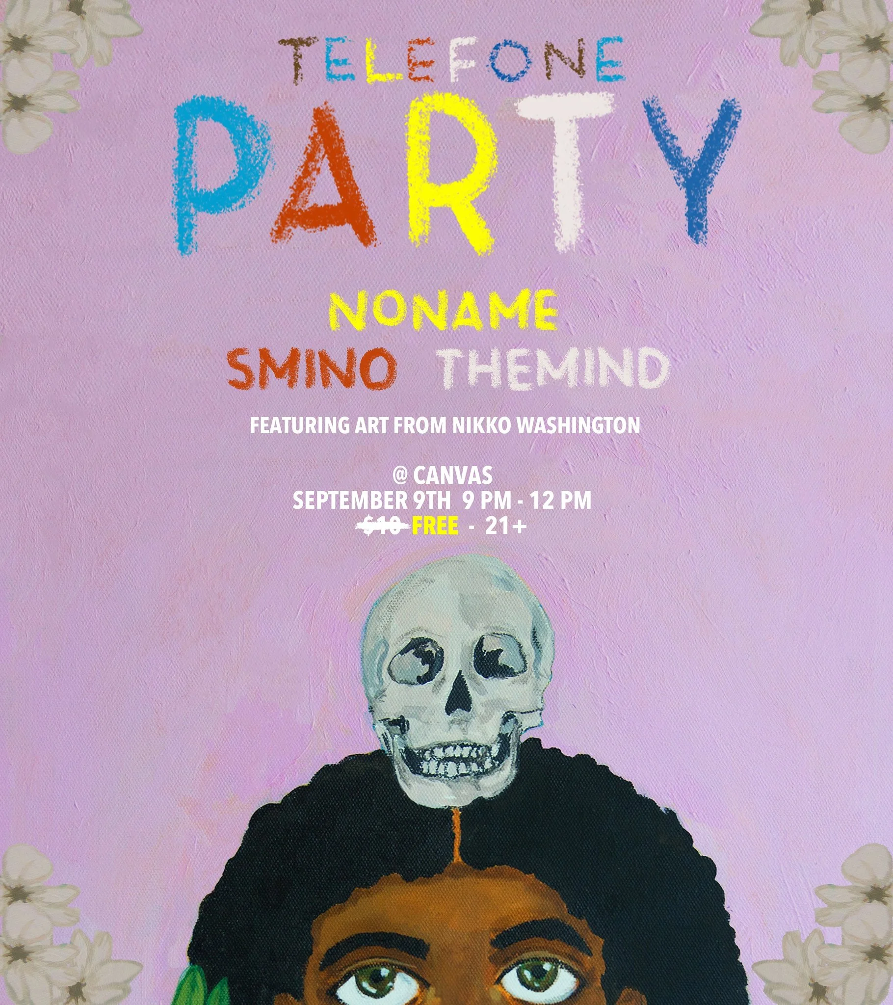 Sept. 9: Telefone Party with Noname, Smino, theMIND Friday, September 9, 2016 9:00 PM 11:59 PM 21:00 23:59 Canvas 2313 W North Ave Chicago, IL (map) Google Calendar ICS View fullsize Doors: 9:00PM | FREE with RSVP | 21+Telefone Party with Noname, Smino, theMINDFeaturing Art from Nikko Washington RSVP