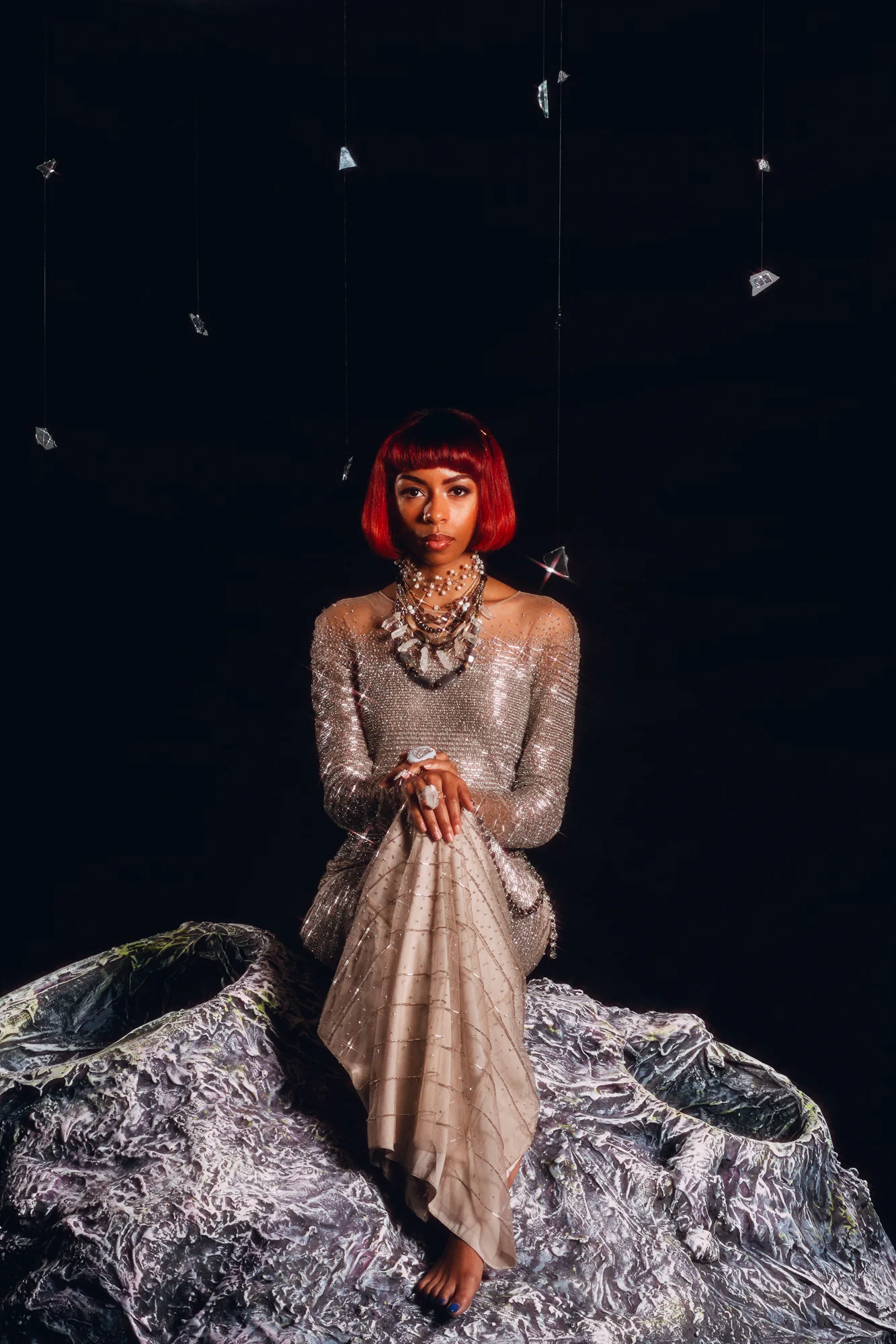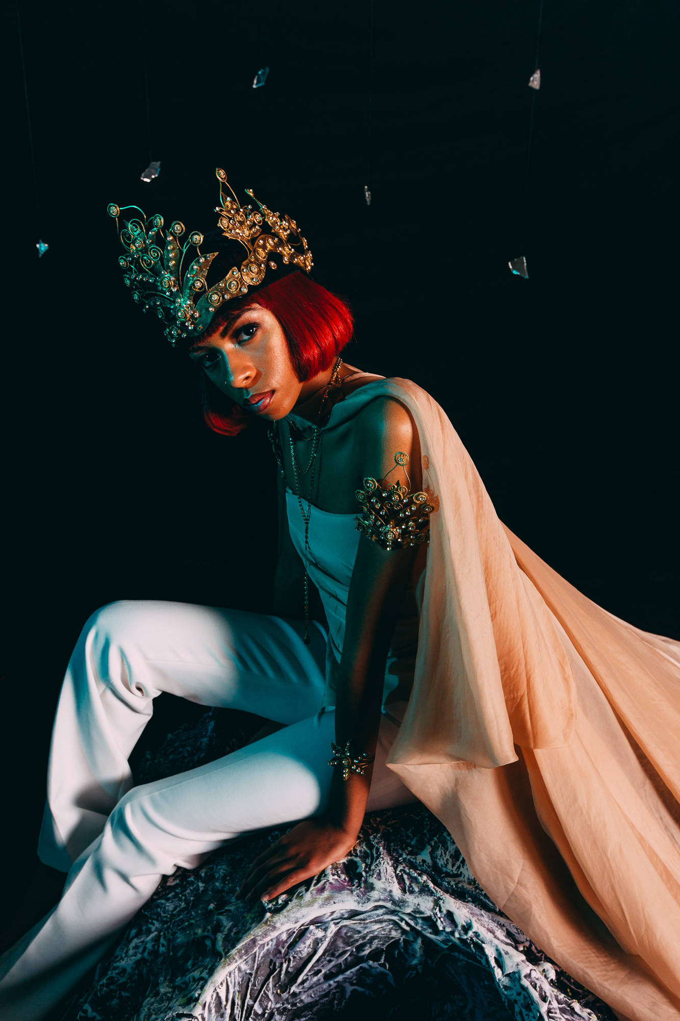 The large studio room was filled with natural light when Ravyn Lenae came in. The crew was delicately stringing pieces of mirror around the halo she would occupy, perched upon a small piece of moon we had made for her. She suited up in the outfits the stylist picked out, clad in regal jewelry and flowing gowns. She posed elegantly, but with strength and purpose. After an exhausting several hours of shooting, we sat down next to some open windows to begin our interview.